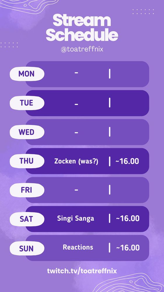Ansonsten geht es Sa+So routiniert weiter. Potentiell gibt es am Mittwoch einen extra Gesangstrainingsstream, aber der ist bewusst nicht eingetragen. Ist eher eine spontane Idee...