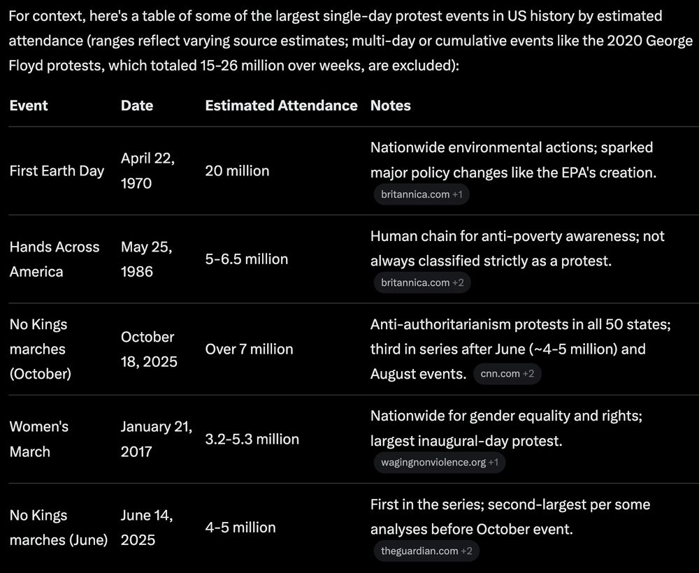 Putting the No Kings marches in perspective - Grok's table: