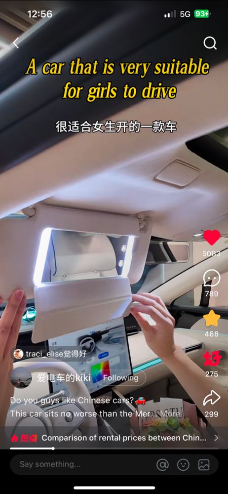 China car, that is banned in the United States, it pulls up to her with her with a command from her phone. No one’s inside the car. Check out the parking features!!
