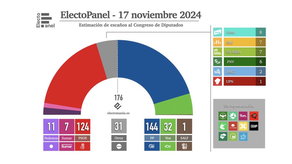 SUMAR y Podemos en empate en intención de voto pero con sorpasso de los morados en escaños según el electopanel @electomania.es