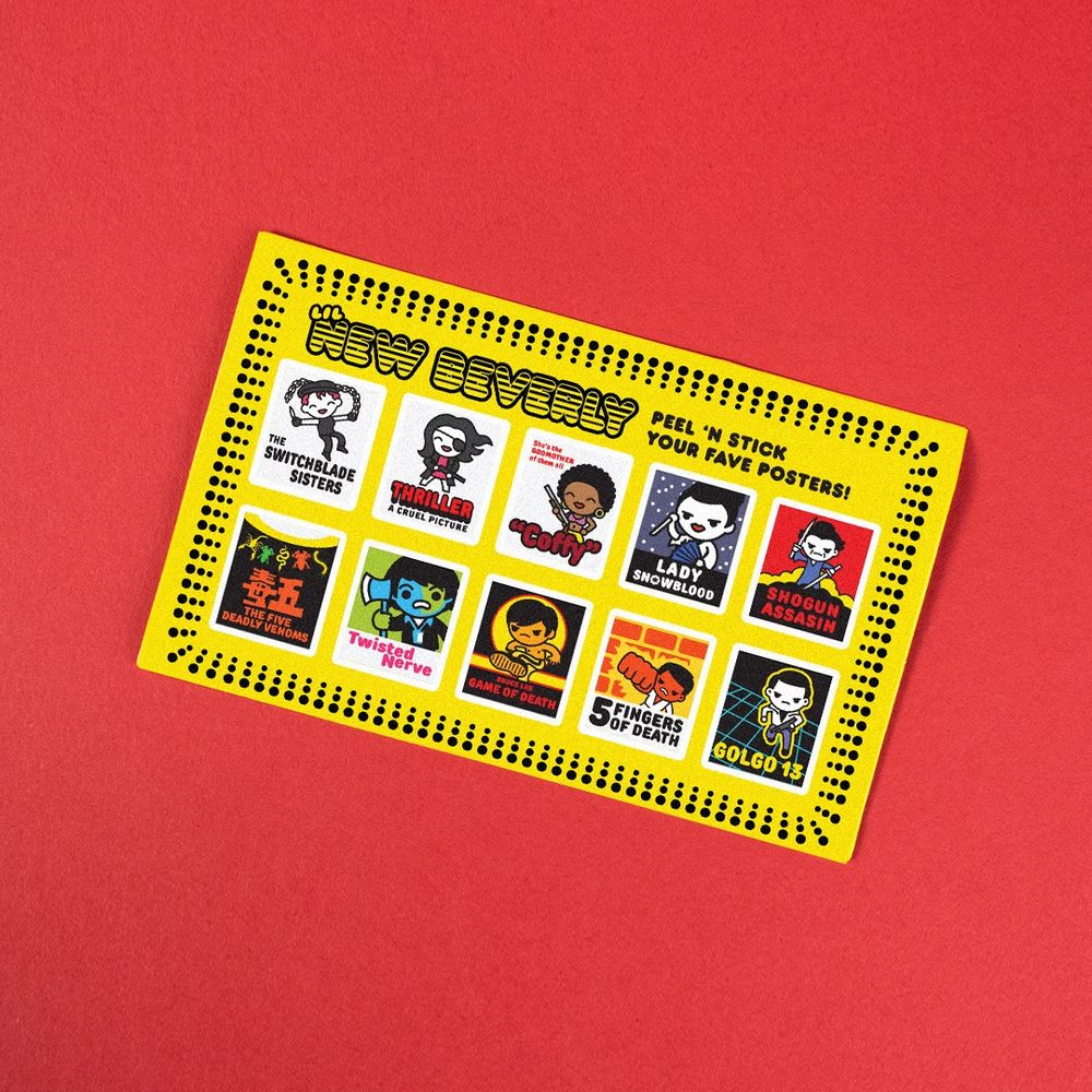 this variant comes with two sticker sheets: a kill bill character poster set, and movies that influenced the movie