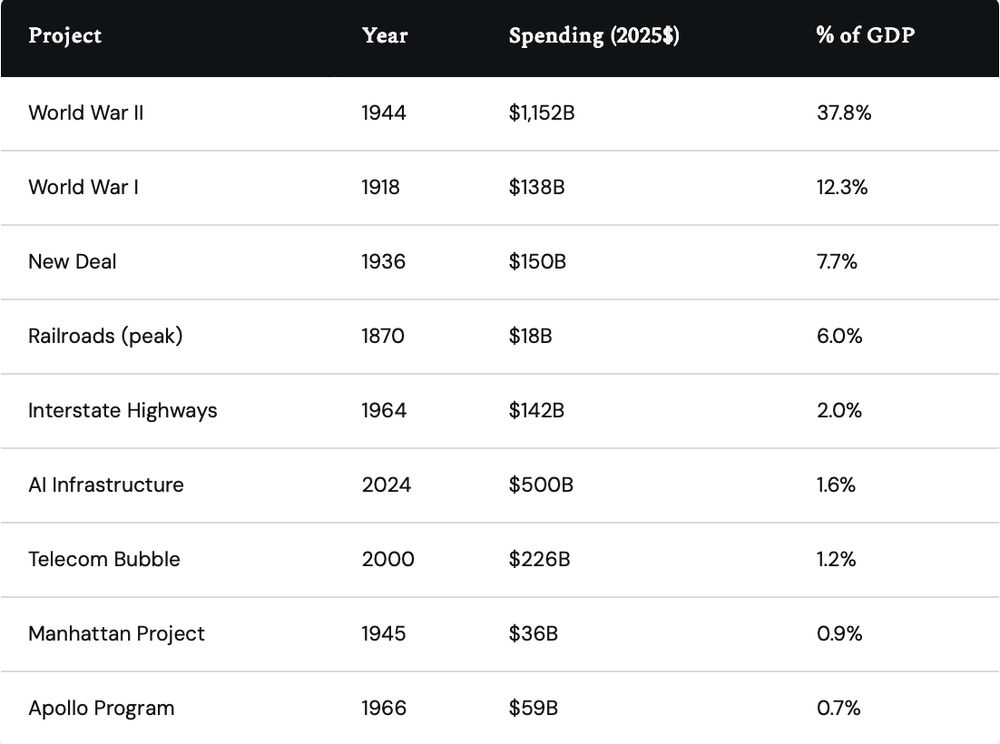AI infrastructure today sits at 1.6%, just above the telecom bubble’s 1.2% & well below the major historical mobilizations.