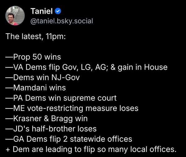Congratulations to all Democrats and Progressives who won USA elections on Tuesday. Keep building momentum to 2026, then 2028 elections. Say NO to Project2025, ICE and radical right.