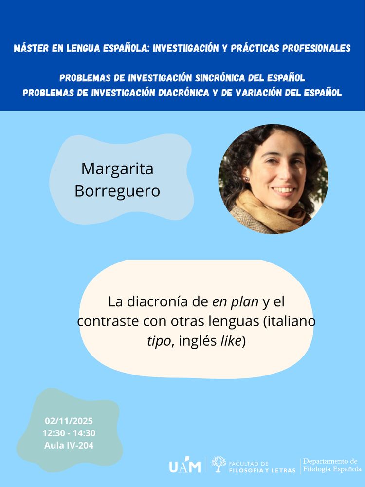 La semana que viene, Margarita Borreguero impartirá el máster de Lengua (compartido con las asignaturas de sincronía y diacronía), con el título "La diacronía de 'en plan' y el contraste con otras lenguas (italiano 'tipo, inglés 'like').