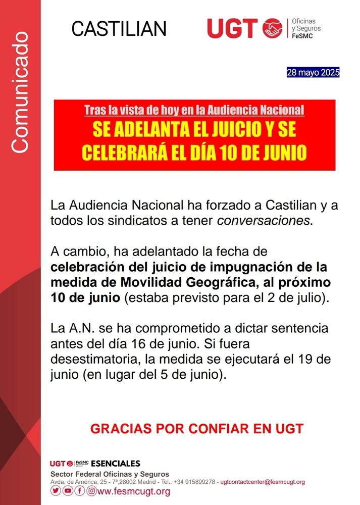 UGT INFORMA: Sentencia estimatoria, la movilidad geográfica que pretendía la empresa del #GrupoKonecta, #Castilian, es un fraude.