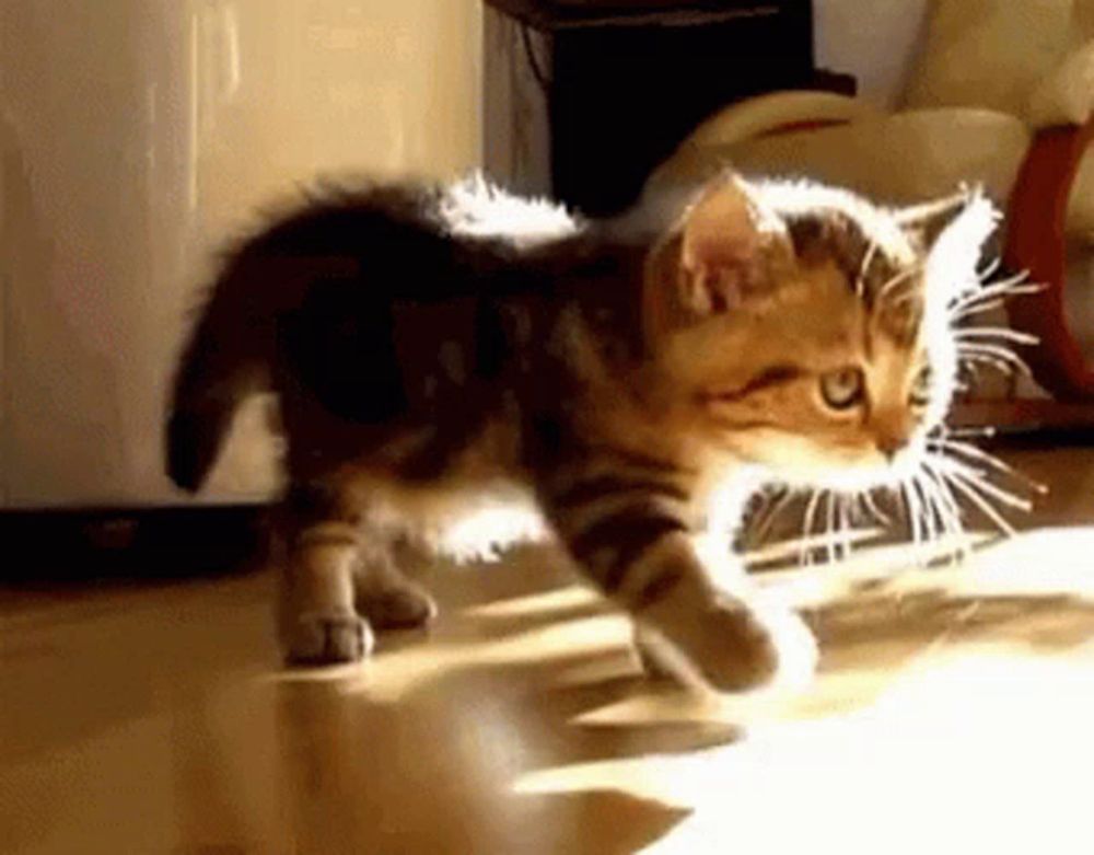ALT: a small kitten is walking on a wooden floor in a room .