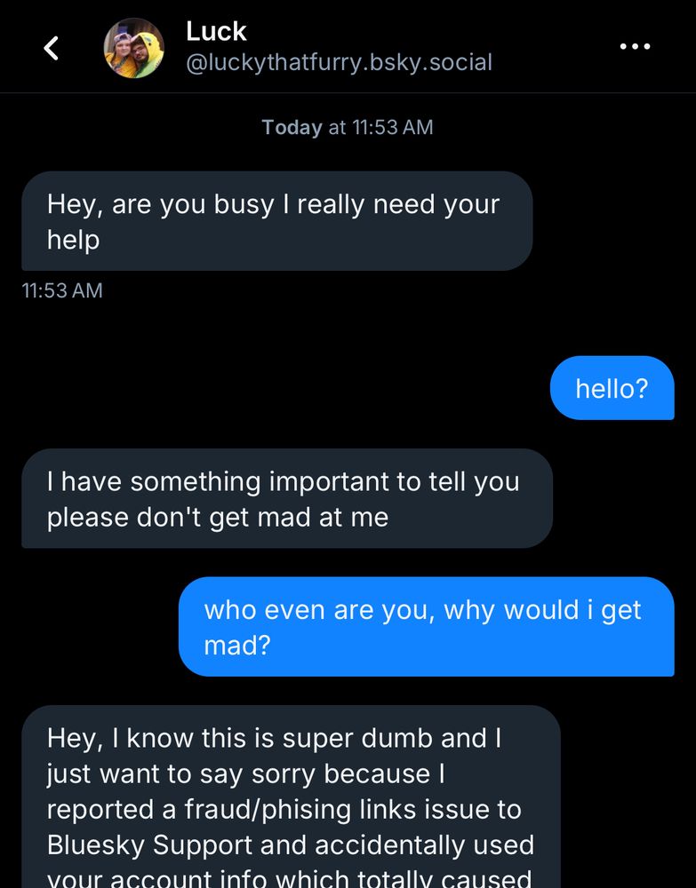 be on the lookout, i saw this person @luckythatfurry.bsky.social was following several of my moots/friends on here, assuming they sent the exact same message(s) to them as well
