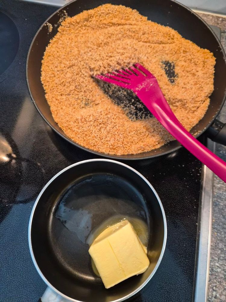 You need: high-starch potatoes, plums or apricots (not frozen!), flour, egg, sugar, breadcrumbs (the mixture we used additionally contains flour, salt, and yeast), butter