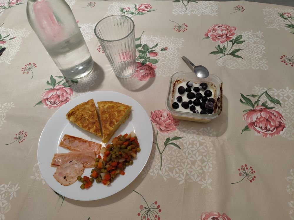Platito equilibrado para cenar. Tortilla de patatas al microondas con menestra de verduras y pavo a la plancha con un postres de manzana y canela con yogur griego light y arándanos. XDD
