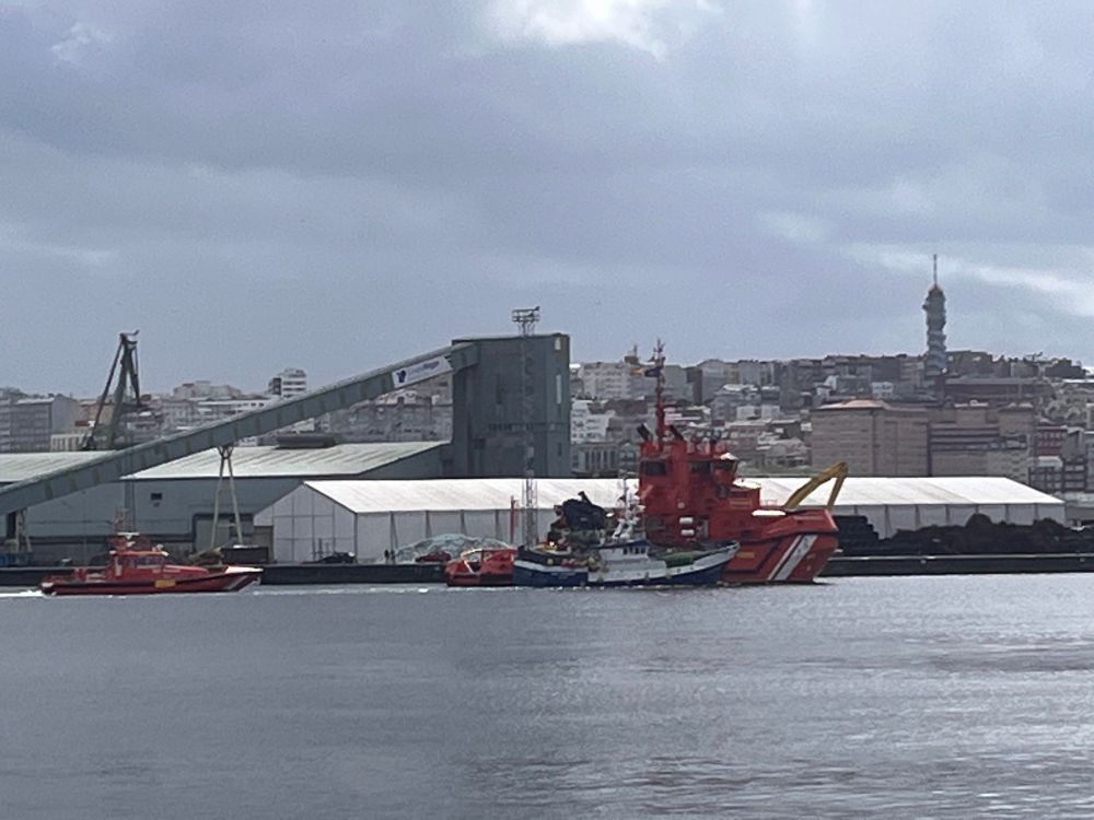 El pesquero Ray Primero remolcado por Salvamento Marítimo, llegando A Coruña hoy al mediodía. El rescate de sus 11 tripulantes y este remolcado, gracias a tus impuestos.