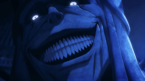 ALT: a close up of a monster 's face with glowing eyes and teeth