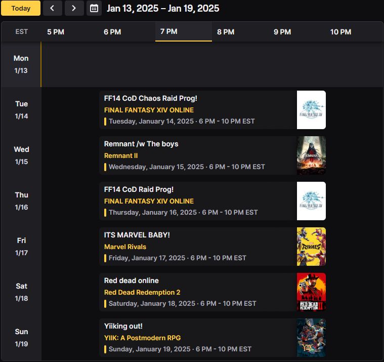 Howdy gamers here's this weeks stream schedule going to be playing a lot off FF14 this month got invited to a chaos alliance raid static so I'll be doing that while waiting for one of my buddies to get back from his trip so we can continue the Elden Ring Co-op!