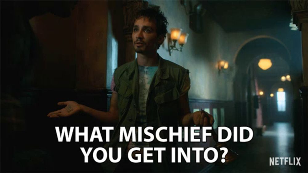 a man standing in a hallway with the words " what mischief did you get into " on the bottom