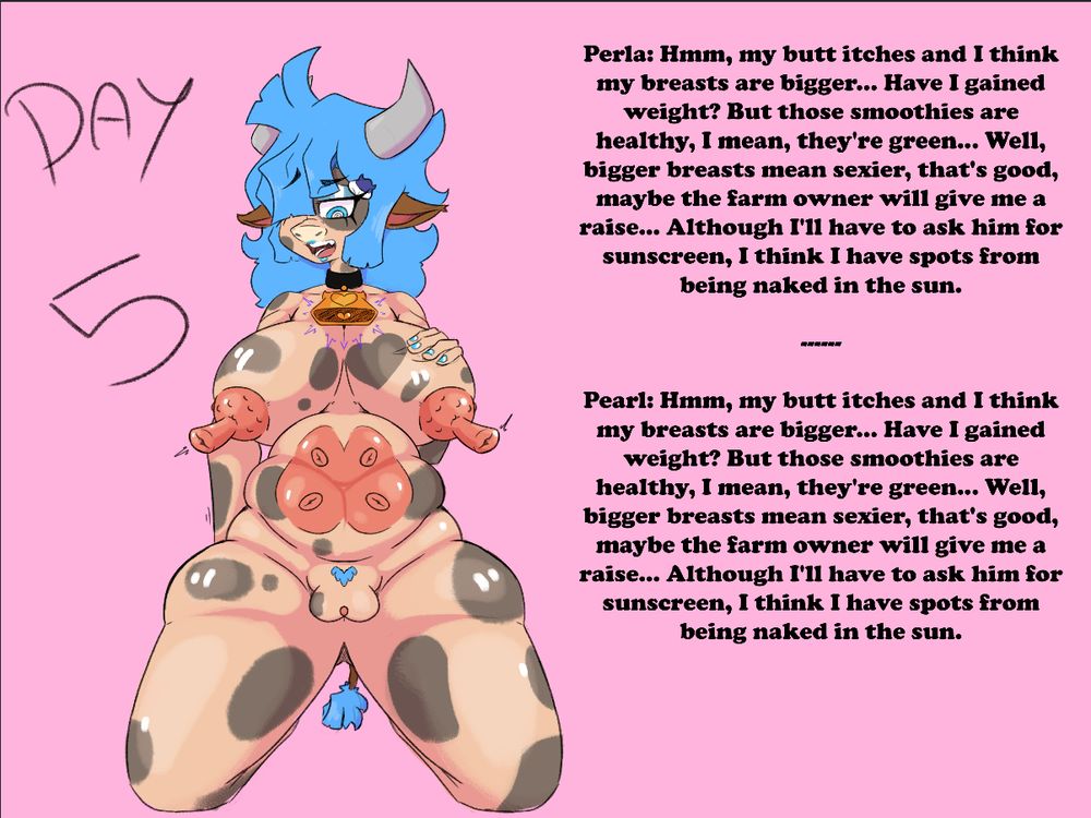 Pearl seems to have noticed some physical changes she is undergoing, but her new, reduced intelligence to the level of a bimbo is preventing her from realizing the problem. She has officially reached the point of no return.