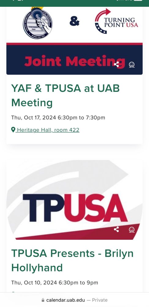 Check this out…https://calendar.uab.edu/group/turning_point_usa