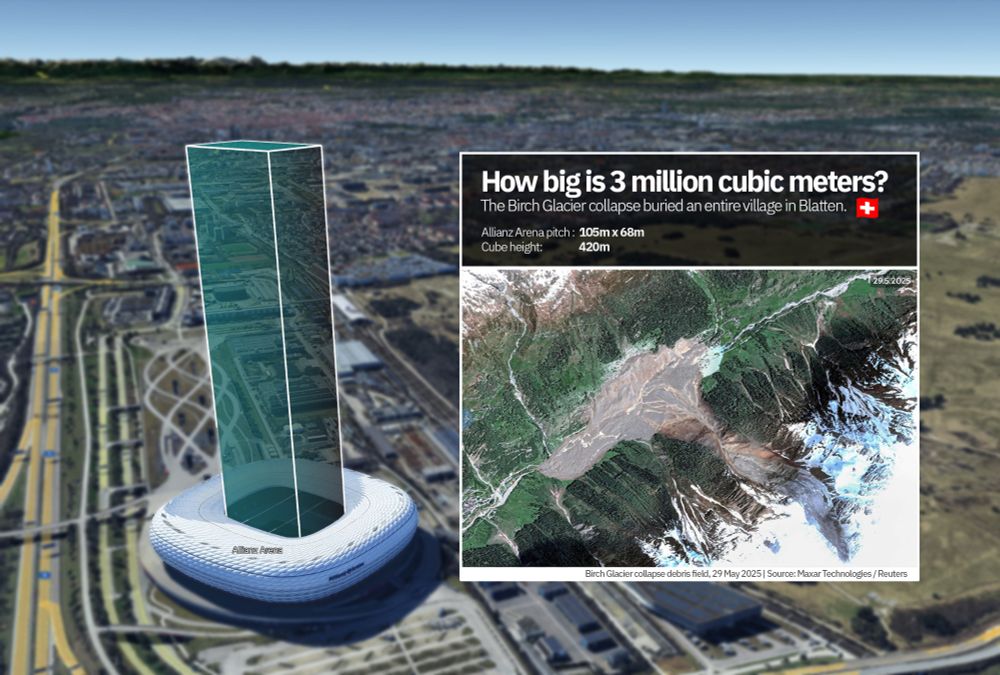 A 420 m cube on the Allianz Arena pitch ≈ 3 million m³ — the glacier/rock debris that buried Blatten (CH).