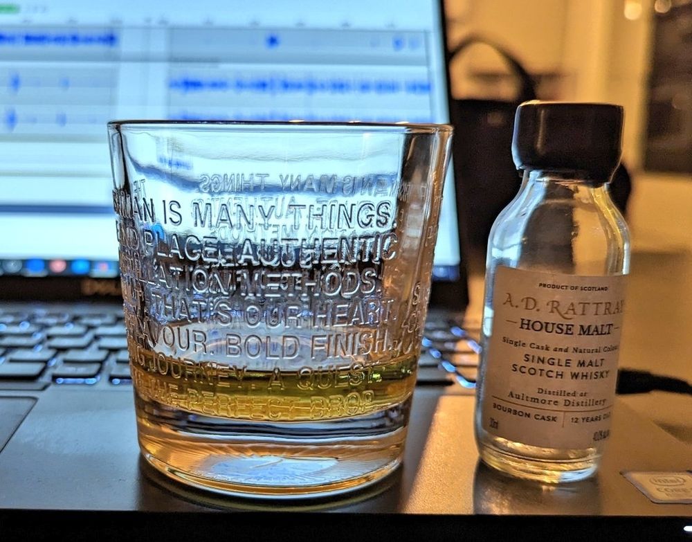 Whisky podcast editing with a dram of A.D. Rattray House Malt.