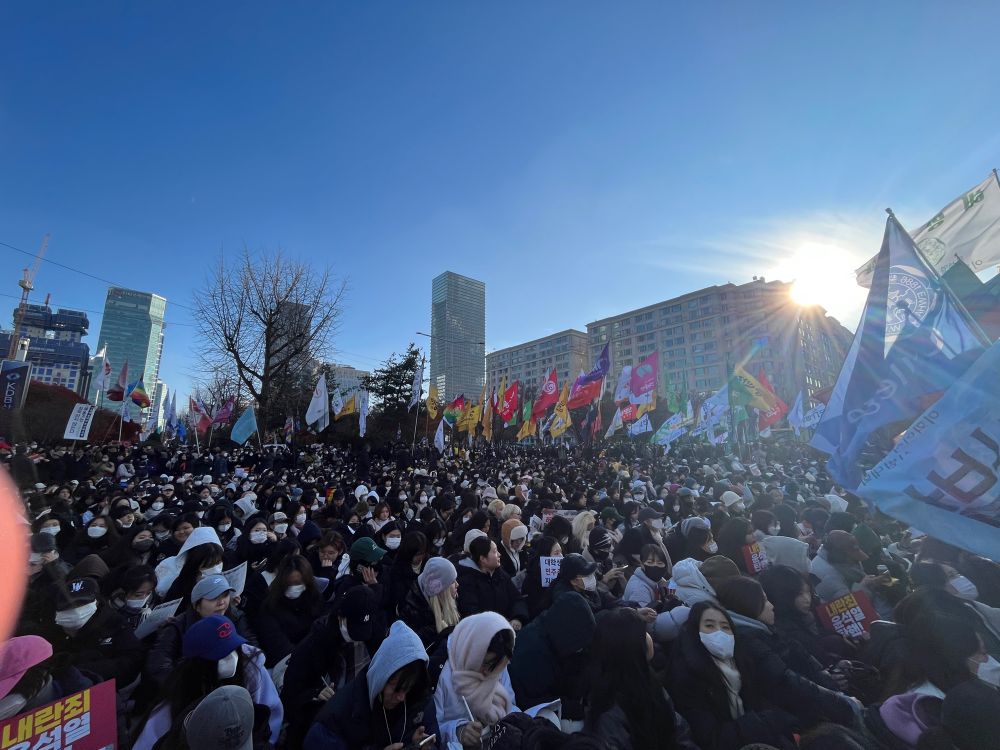 Tens of thousands of protesters gathering near the National Assembly to protest against President Yoon Suk-Yeo.