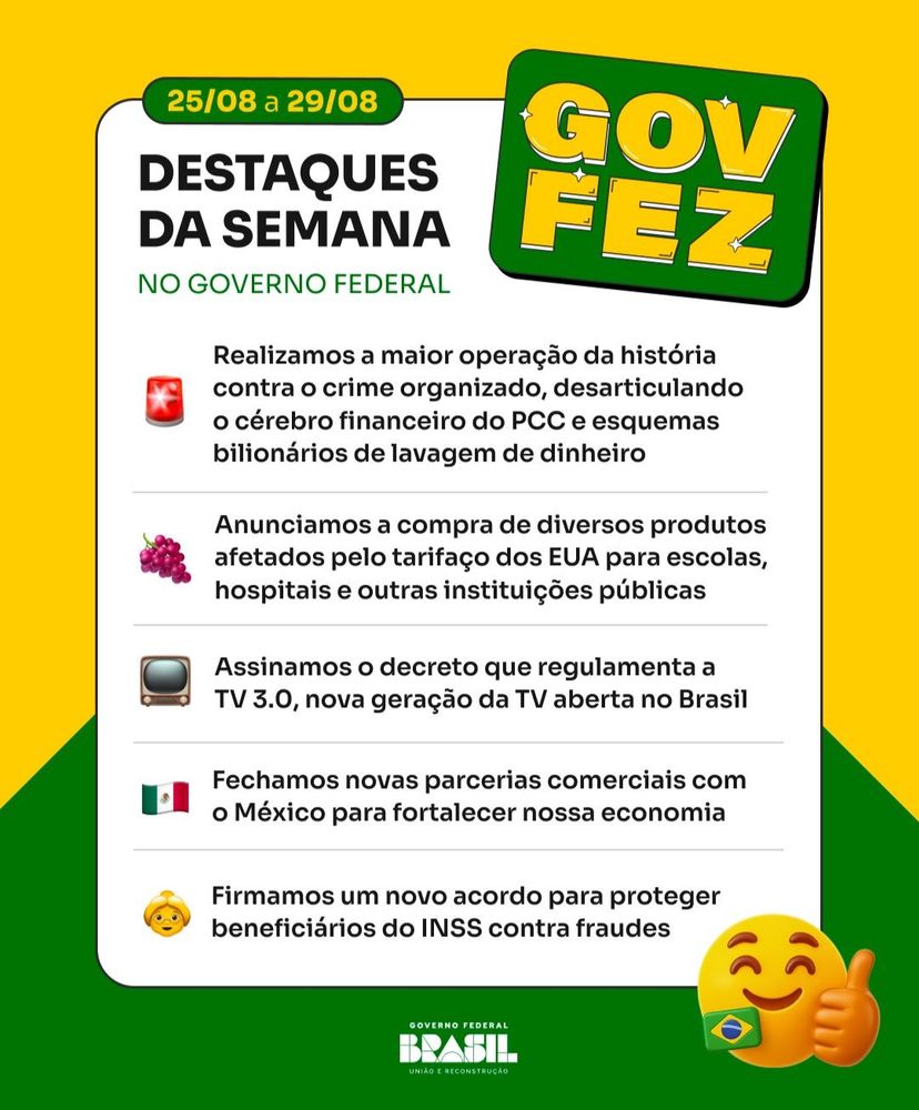 Maior operação da historia contra o crime organizado, auxílio a produtores contra o tarifaço, regulamentação da TV 3.0, novas parcerias com o México e mais proteção para beneficiários do INSS. Veja o que o #GovFez de 25/08 a 29/08 🇧🇷📢