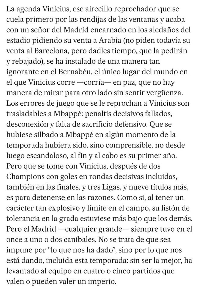 Yo estoy un poco harto de la actitud de Vinicius, y creo que esta temporada no está dando todo lo que puede dar. Le tenemos que apoyar, es nuestro jugador diferencial y estoy seguro que nos callará a los que le criticamos.