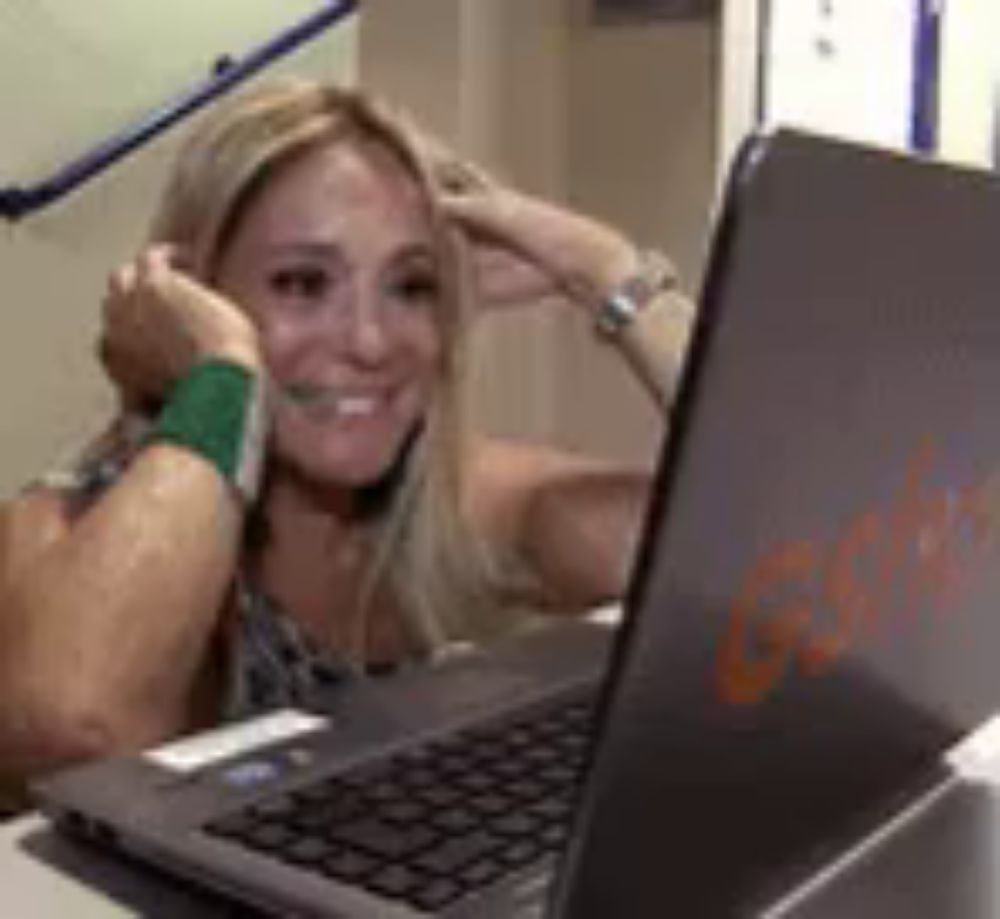 ALT: a woman is smiling while looking at a laptop computer .