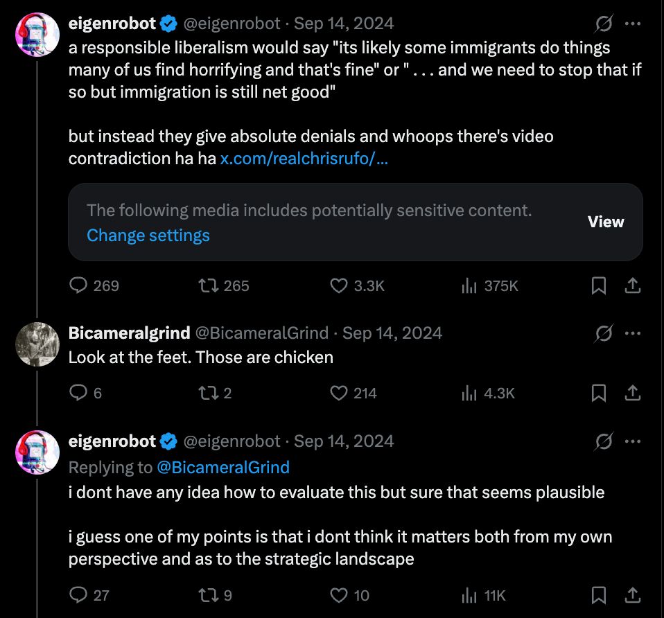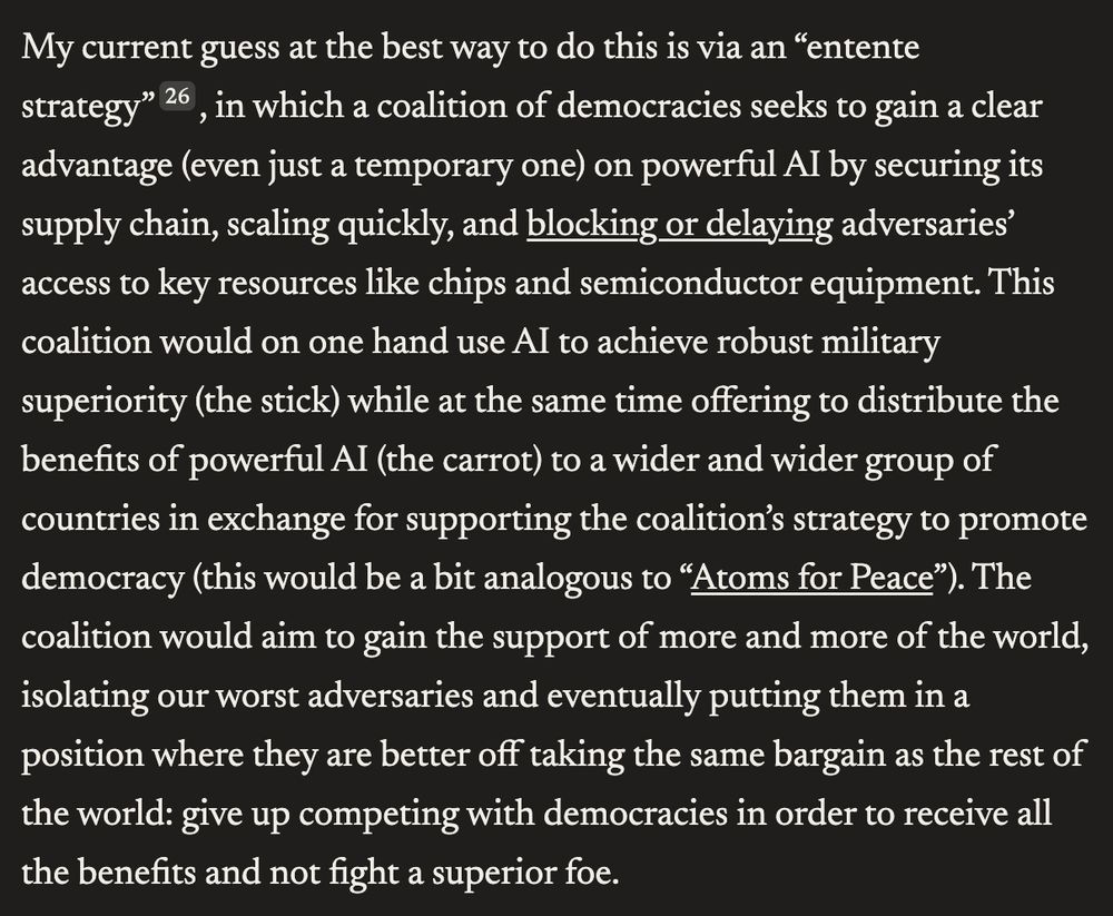 the way people talk about dario amodei is pretty odd, everyone says he's "thoughtful" and the one good ceo (despite partnering with palantir), to me he seems either naive or dishonest about the realpolitick involved