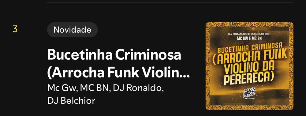 eu fui ver as minhas músicas mais ouvidas na minha máquina do tempo e do nada uma “ bucetinha criminosa” jro mds 😓 KJKKKJKKKKKK