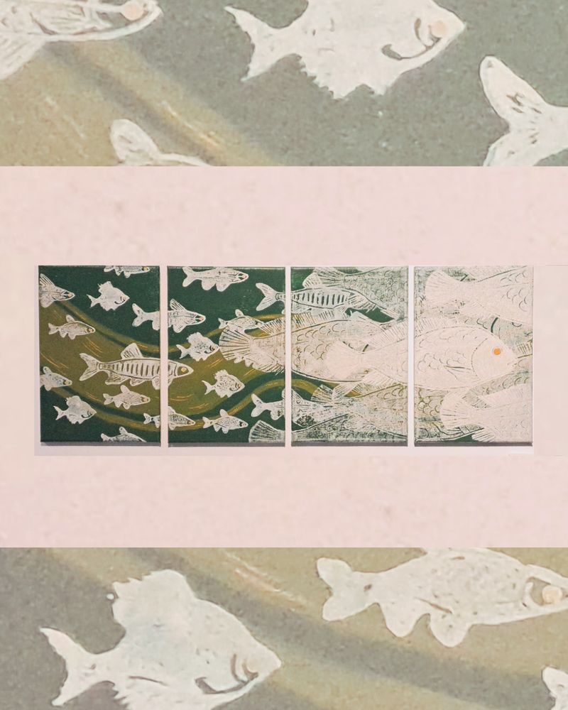 比較特別的是我以版畫雕刻不同魚類,蓋印在畫布上,我想讓魚群像是時間留下的痕跡,帶點不完美的質感。這種方式很像溪流裡的沉積,每一層都疊加出時間的重量。