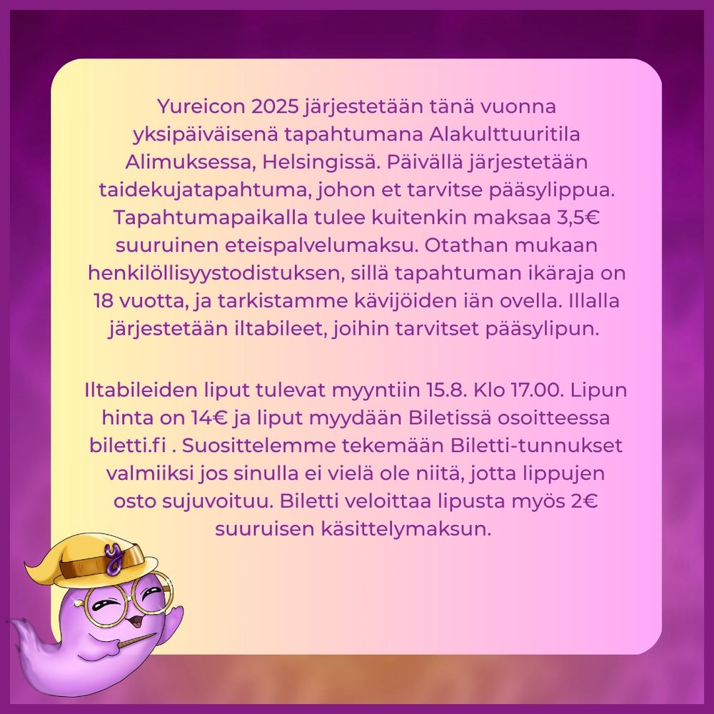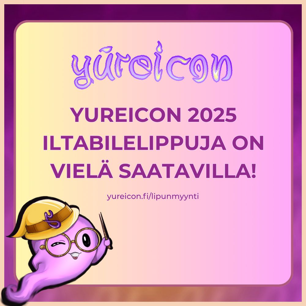Yureiconin 2025 iltabileiden lipunmyynti on alkanut! Lipun hinta on 14€ ja se oikeuttaa sinulle pääsyn Yureiconin iltabileisiin, jotka järjestetään Alakulttuuritila Alimuksessa 11.10.2025 klo 19.00 alkaen. Liput myydään Biletin kautta osoitteessa biletti.fi/e/yureicon-2...