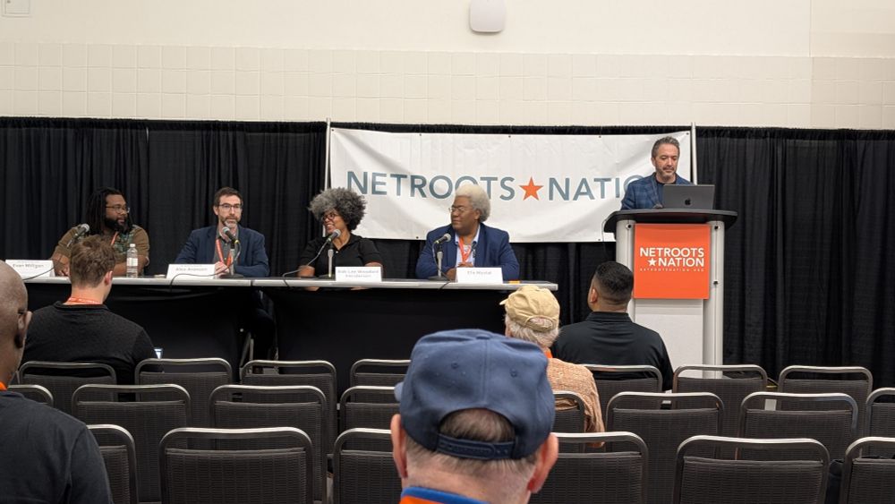 Time to chat about a captured Supreme Court with Evan Milligan (Milligan v. Allen), @alexaronson.bsky.social, @ashdashlee.bsky.social, @elienyc.bsky.social, and @brianbeutler.bsky.social at #nn25!