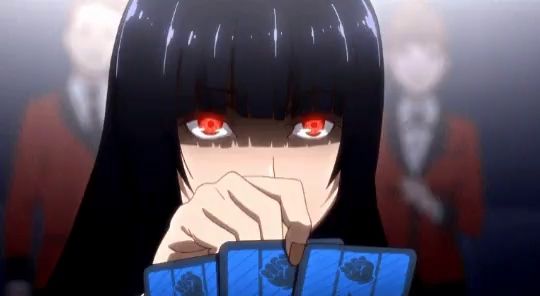 ALT: a girl with red eyes is holding playing cards