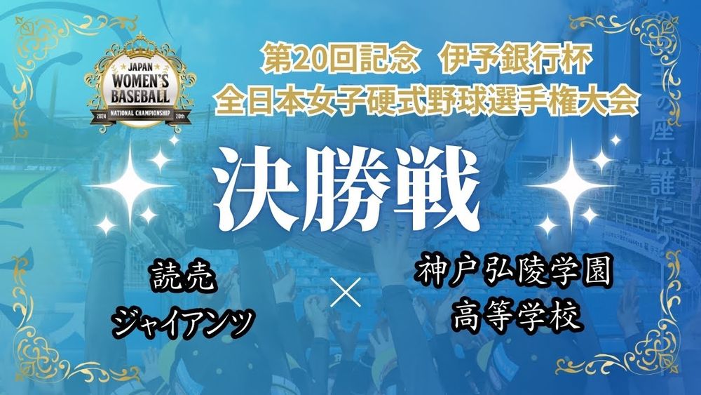 第20回記念 伊予銀行杯 全日本女子硬式野球選手権大会 決勝戦 読売ジャイアンツ vs 神戸弘陵学園高等学校 日時:2024年10月15日(火) 9時00分試合開始予定 場所:坊っちゃんスタジアム 対戦カード: 読売ジャイアンツ vs 神戸弘陵学園高等学校 実況 飯塚治