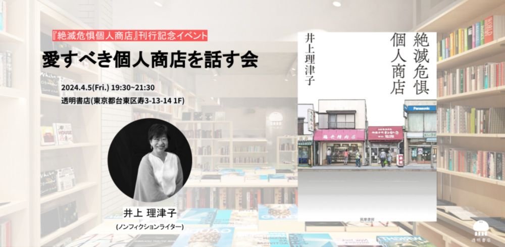 19:30~イベント「愛すべき個人商店を話す会」、『絶滅危惧個人商店』(ちくま文庫)著者の井上理津子さんをお迎えして開催します。お席まだありますのでぜひ!
