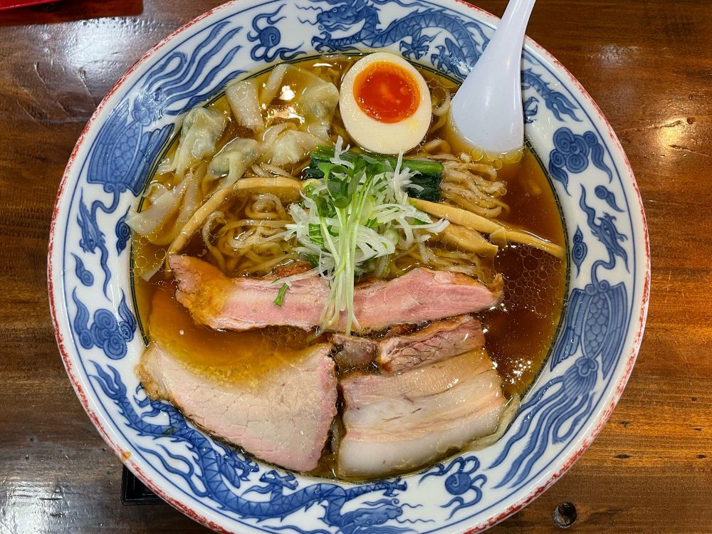 スープは煮干しのビターさが際立つ第一印象から動物系が深みを出してまろやかな味わいに。太麺でもっちり食感で存在感あり。2種のチャーシューは肉肉しく柔らか。ワンタンは肉餡ジューシーで味玉は濃い味で凄い!ほっこりしました。ご馳走様でした!