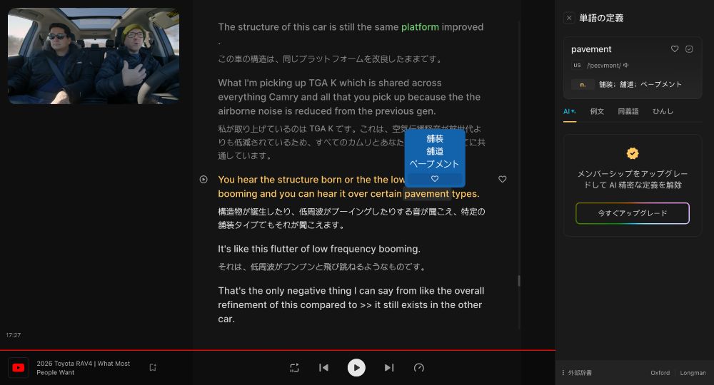 「フルスクリーンモード」「分割表示モード」など視聴シーンに応じた表示設定を提供。オフライン字幕エクスポート機能により、通勤中や旅行先でもモバイル端末で学習を継続できます