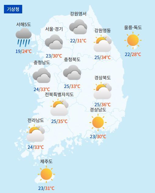 수원 : 흐림/흐림, 19℃/23℃, 30%/40%
