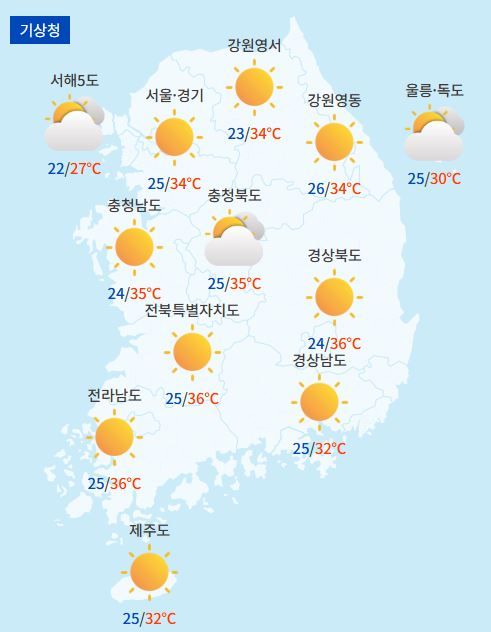 남부 지역은 전주 23.7℃, 광주 21.9℃, 목포 22.7℃/0.1mm, 여수 23.1℃, 군산 23.6℃, 순천 20.9℃, 대구 24.3℃, 부산 24.6℃, 울산 23.3℃, 창원 24℃, 양산시 25.1℃, 진주 21.7℃, 경주시 24.1℃, 구미 24.2℃, 김해시 23.6℃, 포항 24.3℃, 거제 22.8℃, 제주 26.7℃로 나타났다.