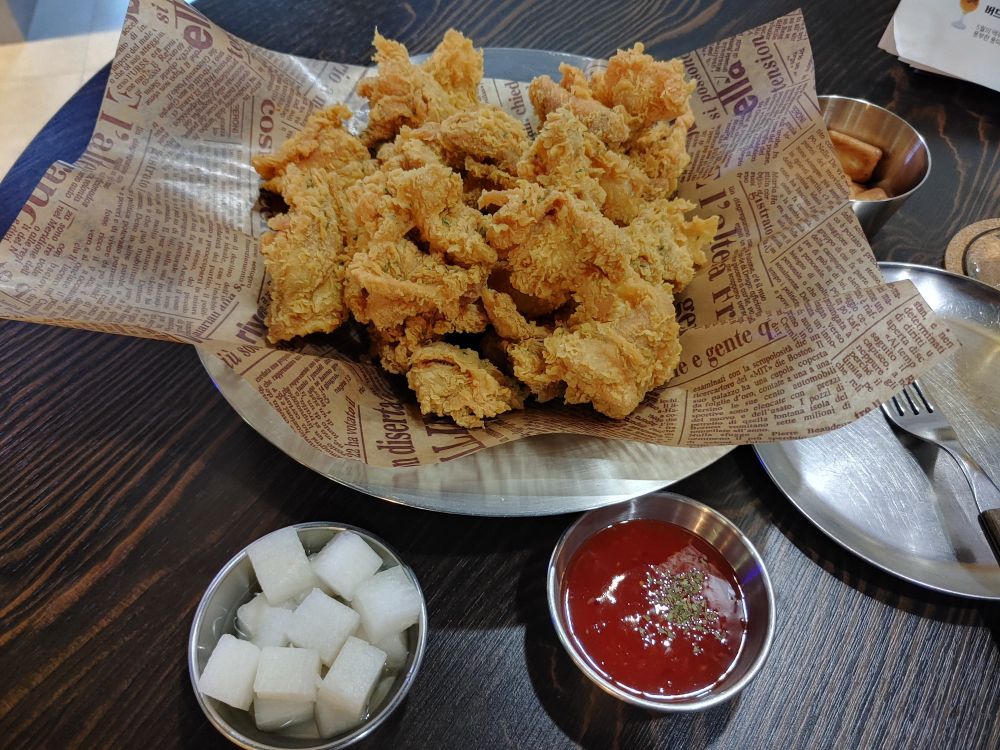 그냥 먹으면 좀 싱거운 편이라, 같이 나오는 소스나 치킨무, 피자용으로 비치되어 있기는 하지만 타바스코 소스를 활용하면 맛나게 먹을 수 있다.😋