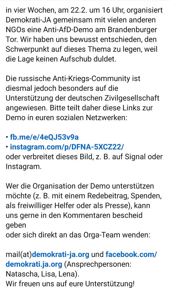 In vier Wochen, am 22.2. um 16 Uhr, organisiert Demokrati-JA gemeinsam mit vielen anderen NGOs eine #AntiAfD-Demo am Brandenburger Tor.