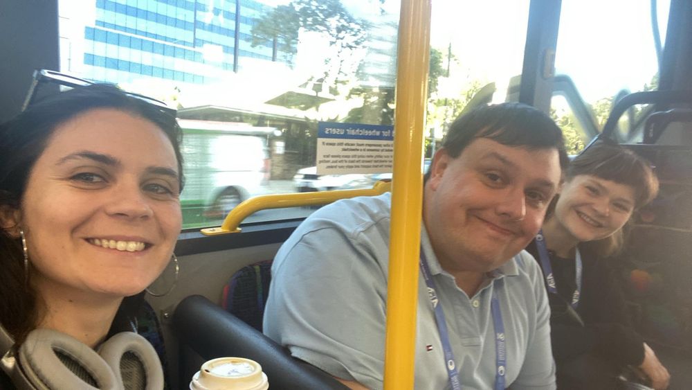 #AusPSA2024 kicking off with Emily Foley, Josh Sunman and @phoebehayman.bsky.social (slightly late) on Perth's gloriously free Purple Cat bus.