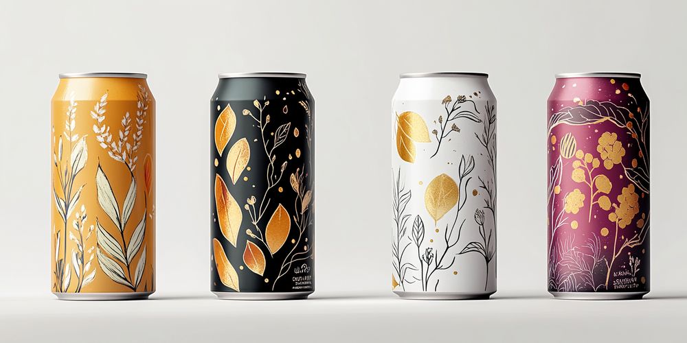The showcased beverage cans feature a breathtaking fusion of natural artistry and modern sophistication.