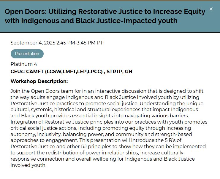 Open Doors is excited to present at the California Alliance 2025 Conference in Anaheim! Come join us for this incredible opportunity to be in conversation with some of the most dedicated professionals in the field. #OpenDoorsTraining #cacsf #catalystcenter #conference #training #restorativejustice