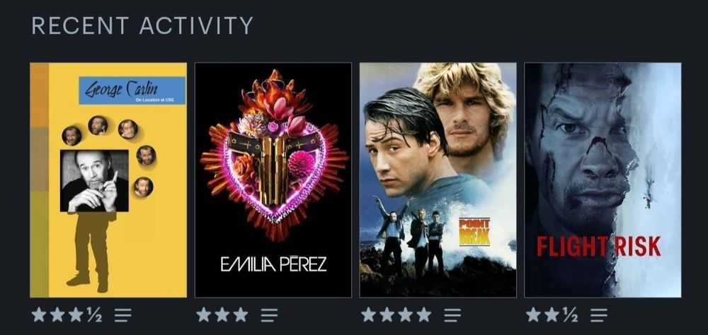 #LetterboxdFriday #FilmSky #LastFourWatched #FlightRisk #PointBreak #EmiliaPérez #GeorgeCarlin