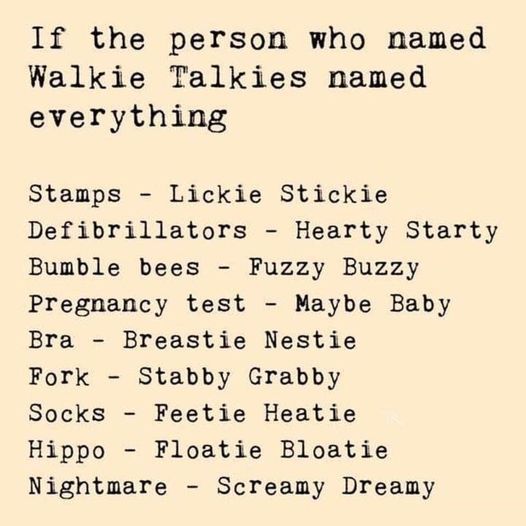 #walkietalkies #names #stamps #defibrillators #bumblebees #pregnancytests #bras #forks #socks #hippos #nightmares