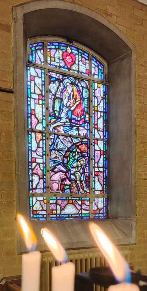 A stained glass window appropriately featuring St Francis.