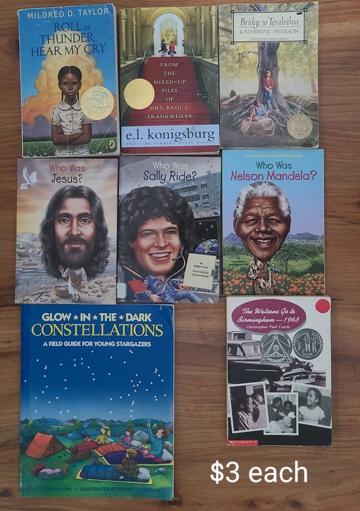 Kids books for sale. Prices shown on photo, media mail shipping not included. Smoke free cat friendly home. #chapterbooks #picturebooks #tweenreads #teenbooks #booklover #middlegrade #booksforsale #nonfiction #mathgames #STEM