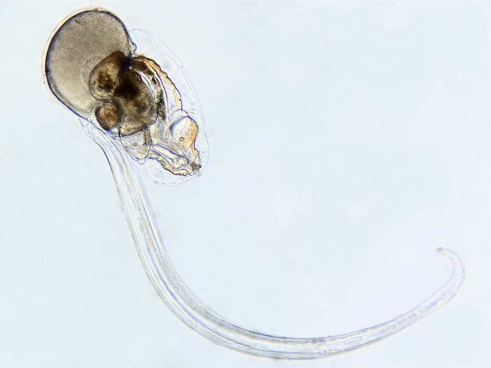 Appendicularians are small tadpole-shaped marine animals that catch food particles in their mucus mesh “house”. The charge of particles’ surfaces affects whether they are ingested into the appendicularian’s gut or retained in the house - read more here: doi.org/10.1002/lno.... (Feb 2025)