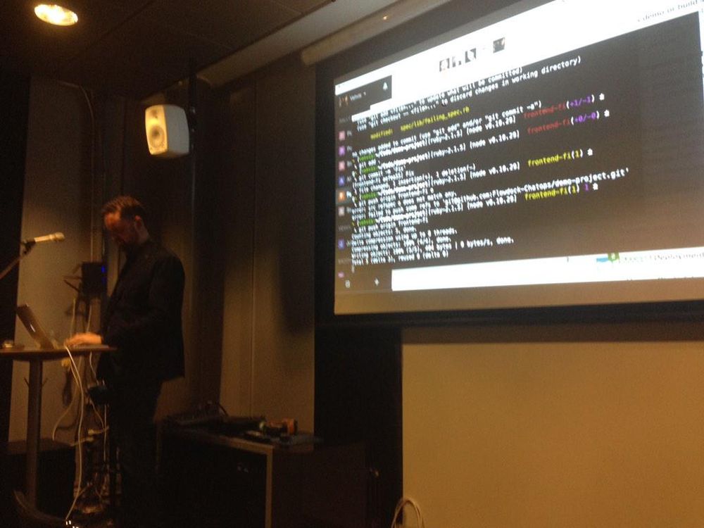 Chatbots for builds by @Mumakil from @flowdock. Fixes git conflicts live on stage. @frontendfinland #frontendfi http://t.co/TbkR4QP0by